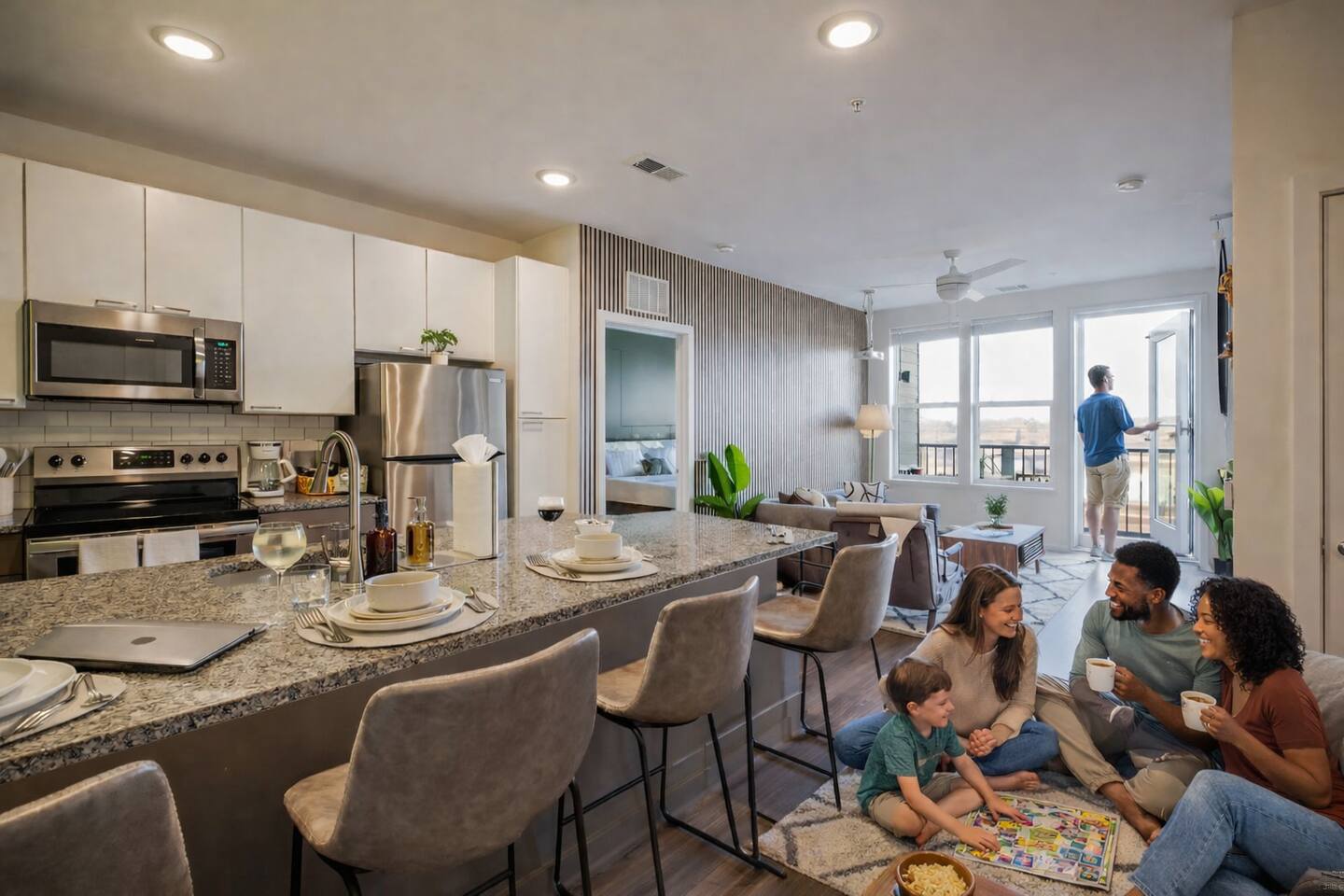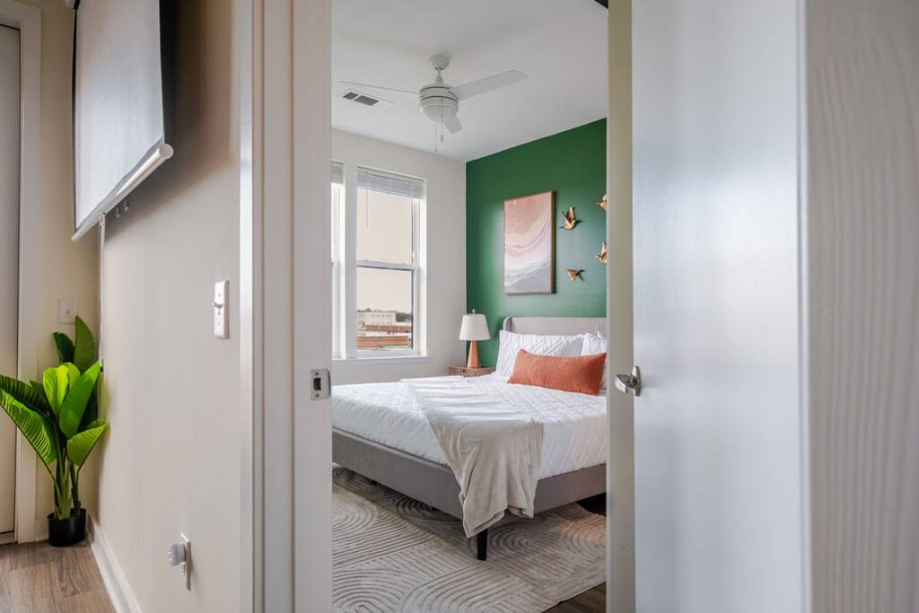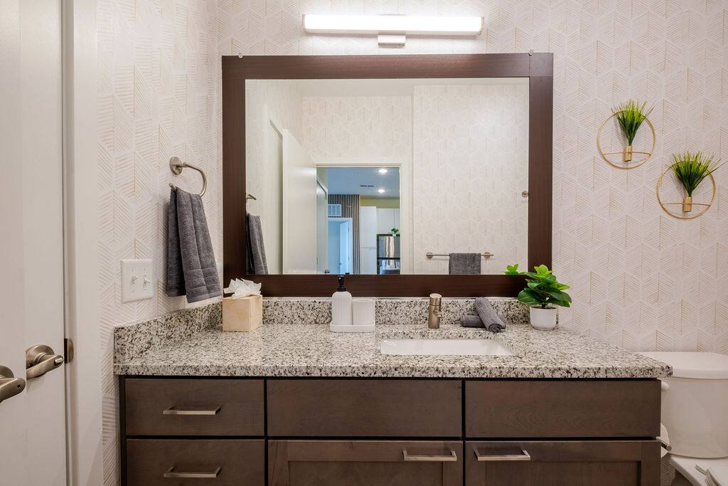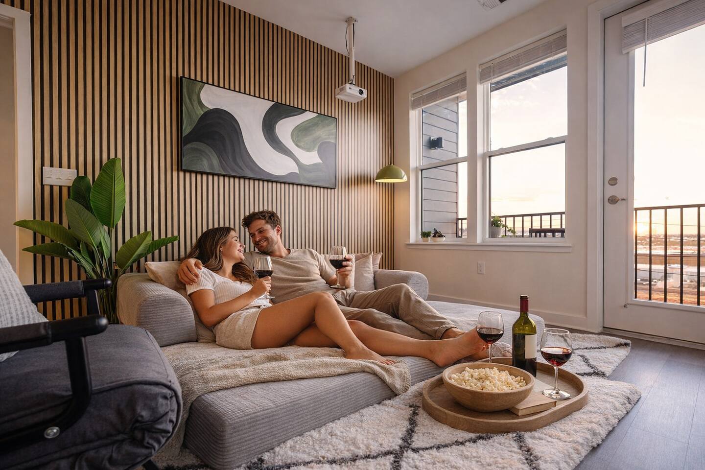 Enjoy a stylish 2-bed, 2-bath luxury retreat featuring two king bedrooms, walk-in closets, full-length mirrors, and a private balcony. The living area offers island bar seating, a full modern kitchen, and a dedicated coffee bar for easy mornings. Relax with cinematic nights on the 80” projection screen in a bright, beautifully furnished space designed for comfort, productivity, and true home-away-from-home living.