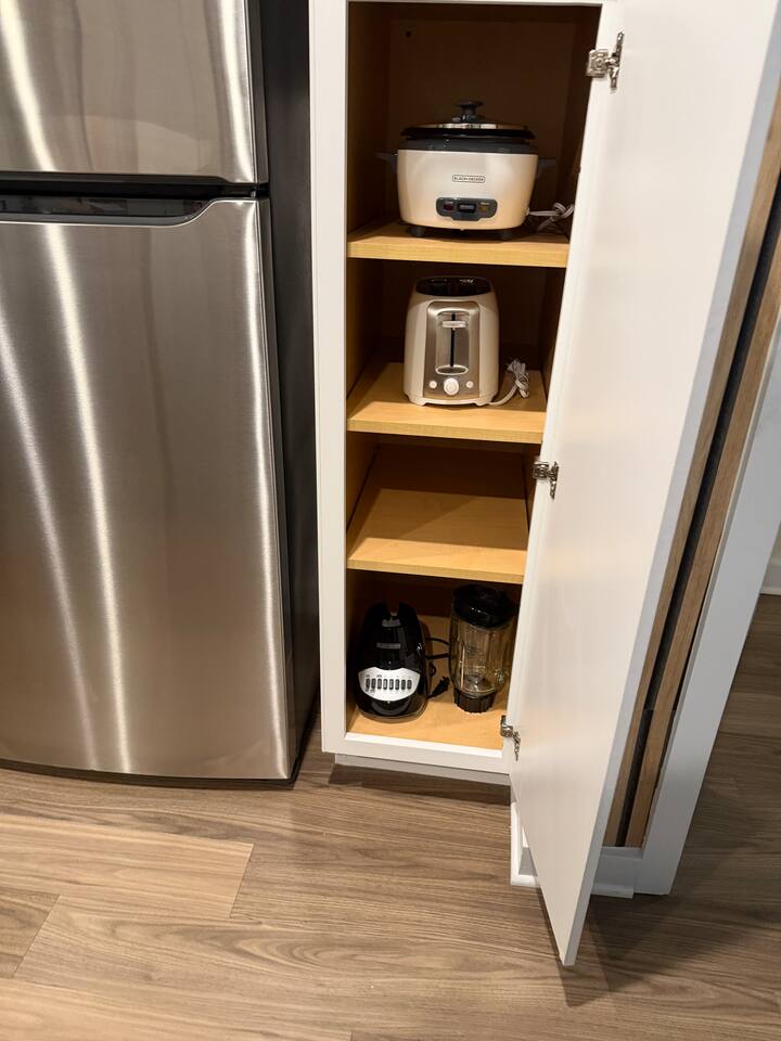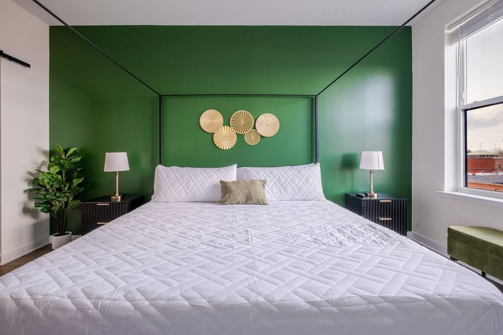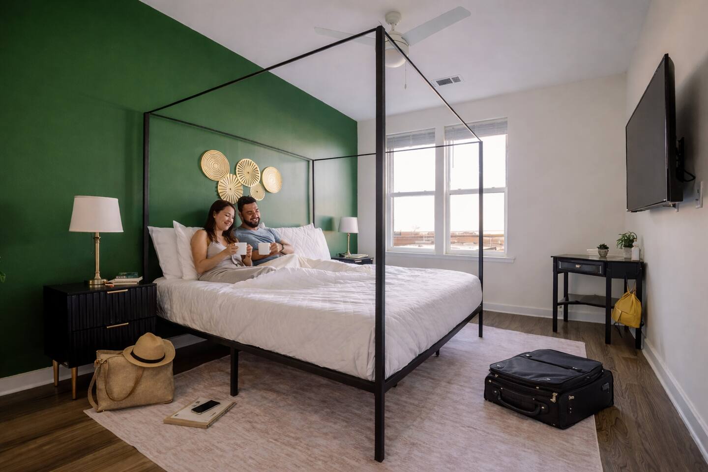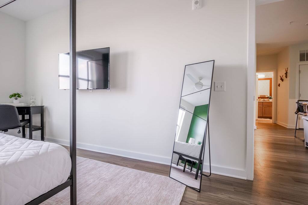 Enjoy a stylish 2-bed, 2-bath luxury retreat featuring two king bedrooms, walk-in closets, full-length mirrors, and a private balcony. The living area offers island bar seating, a full modern kitchen, and a dedicated coffee bar for easy mornings. Relax with cinematic nights on the 80” projection screen in a bright, beautifully furnished space designed for comfort, productivity, and true home-away-from-home living.